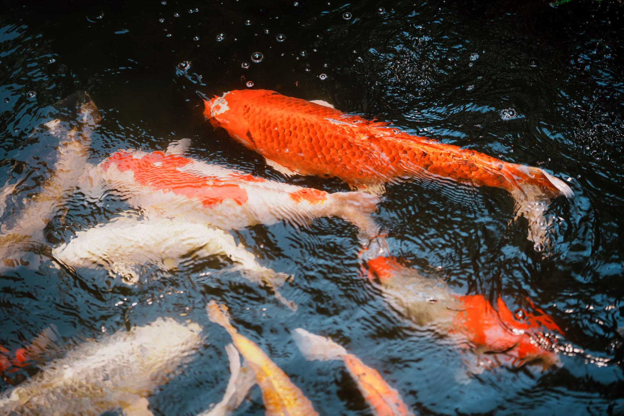 迫力ある滝と、優雅に泳ぐ鯉。